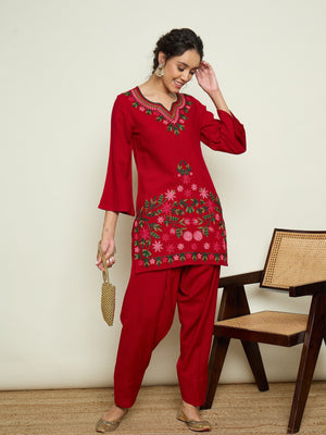 Women Red Woollen Embroidered Sweetheart Short Kurta With Farshi Salwar