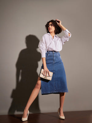 Women Blue Denim Side Slit Midi Skirt
