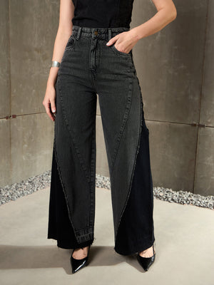 Women Black Washed ColorBlock Wide Leg Jeans