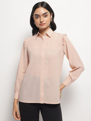 Women Peach Ruffle Shoulder Semi Sheer Shirt