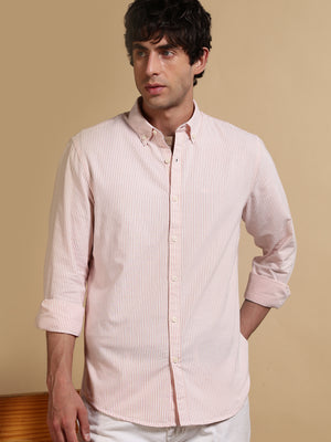 Men Orange Cotton Oxford Slim Fit Striped Shirt