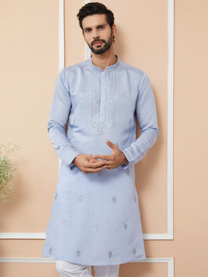 Men Blue Embroidered Chanderi Silk Straight Kurta