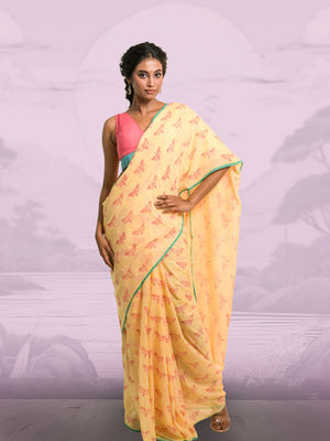 Flutterfly Soft Yellow Handloom Mul Cotton Saree with Handblock-Printed Butterfly Motifs