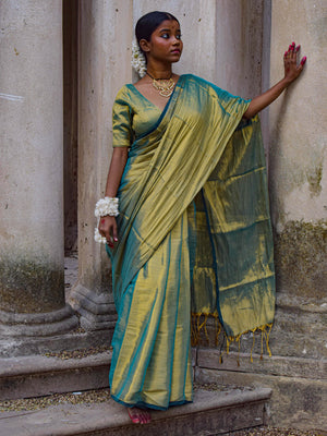 Kanak Olive Green Handloom Mul Cotton Saree with Zari Stripes