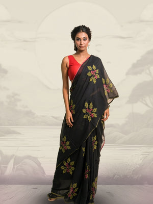 Joys of Holly Black Handloom Mul Cotton Saree with Handblock-Printed Holly Leaf Motifs
