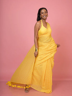 Basant Bahar Yellow Handloom Mul Cotton Polka Dotted Saree