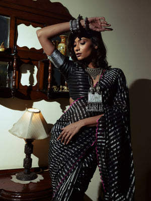 Arcane Sorceress Black Handloom Cotton Saree with Zari Stripes and Scalloped Border
