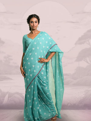 Dandelions Turquoise Blue Handloom Mul Cotton Saree with Handblock-Printed Dandelion Motifs