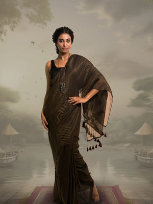 Zari Mridang Dark Brown Handloom Mul Cotton Saree with Zari Stripes