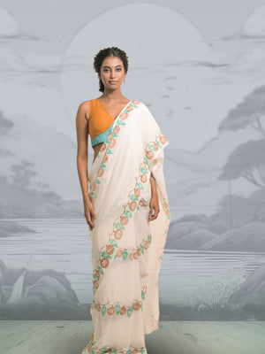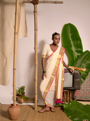 Chandralekha Off white mul cotton handwoven saree with golden and pink border