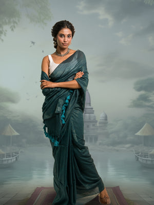 Harit Shringaar Viridian Green Handloom Mul Cotton Saree with Zari Stripes