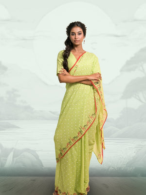 Reindeer Ready Pista Green Mul Cotton Saree with Handblock-Printed Polka Dot and Reindeer Motifs