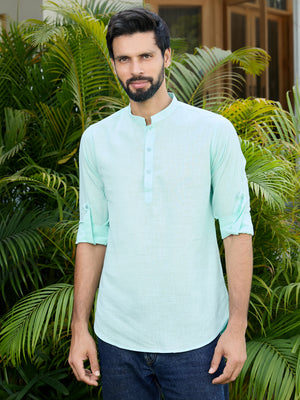 Men Sea Green Pure Cotton Slub Short Kurta