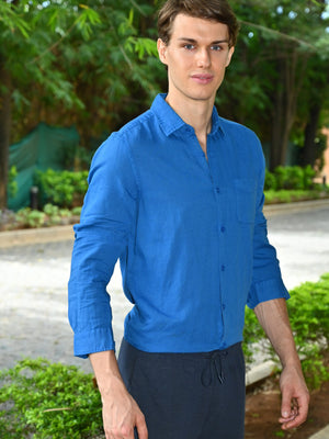 Men Goofy Cotton Linen Shirt Blue