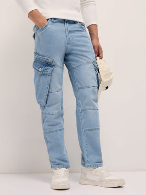 Men Light Blue Mid-Rise Straight Fit Cargo Jeans