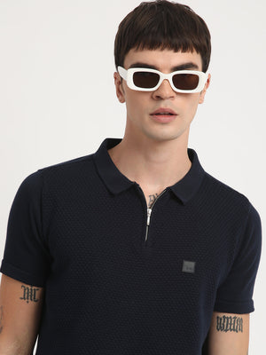 Men Ardor Edition Blue Self Design Slim Fit Knitted Polo Collar T-shirt