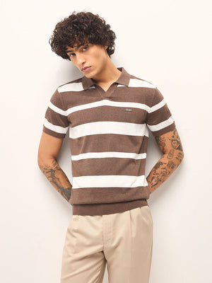 Men Brown and White Horizontal Stripes Slim Fit Polo