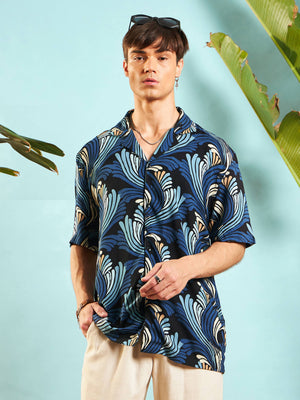 Men Blue & Black Tropical Print Oversized Shirt