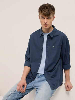 Men Blue Cotton Solid Relaxed Fit Overshirt