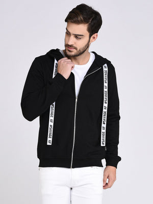 Men Black Fleece With Stripe Tape Patch On Sleeve Hooded SweaT-Shirt