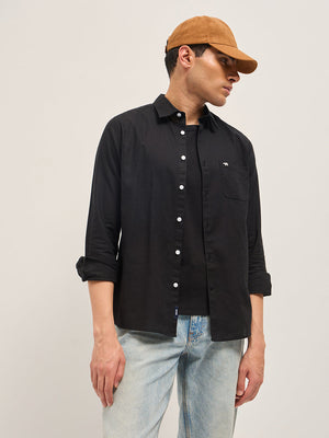 Men Black Cotton Linen Slim Fit Solid Casual Shirt