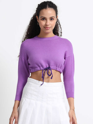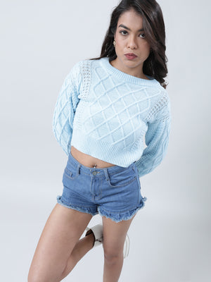 Women Regular Fit Knitted Light Blue Cropped Sweater