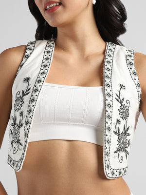 Women White & Black Printed Embroidered Short Jacket