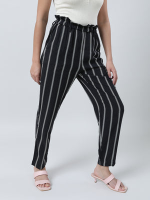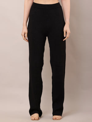 Women High-Rise Black Ribbed Acrylic Winter Trousers