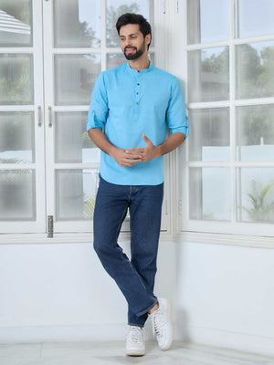 Men Cream Solid Cotton Straight Kurta With Emboridered Neckline