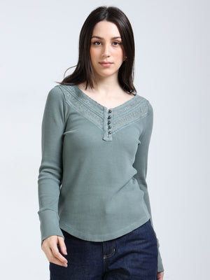 Women Green & White Striped shirt with Frill collor and placket