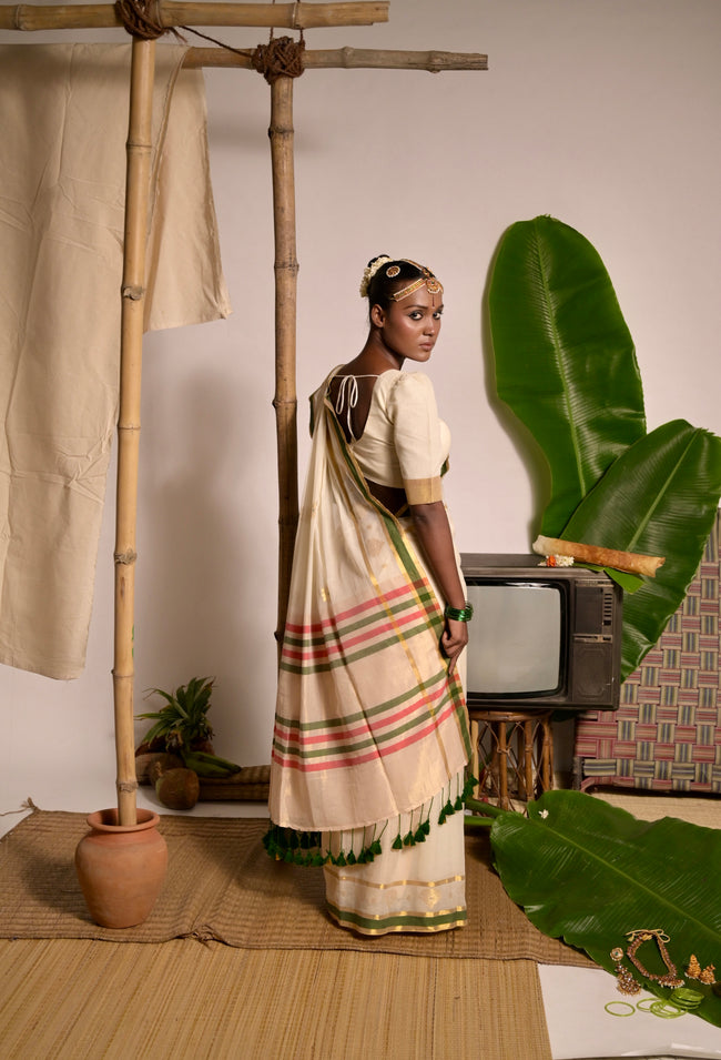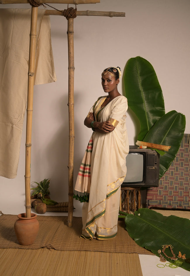This off-white mul cotton saree exudes elegance and festive charm with its stunning green and zari border. Meticulously woven over seven days, it features intricate weaves inspired by Kathakali ornaments, celebrating traditional artistry. The pallu is adorned with delicate tassels, adding a playful touch to its graceful drape. Perfect for cultural gatherings and festive occasions, this saree beautifully blends heritage motifs with timeless sophistication.