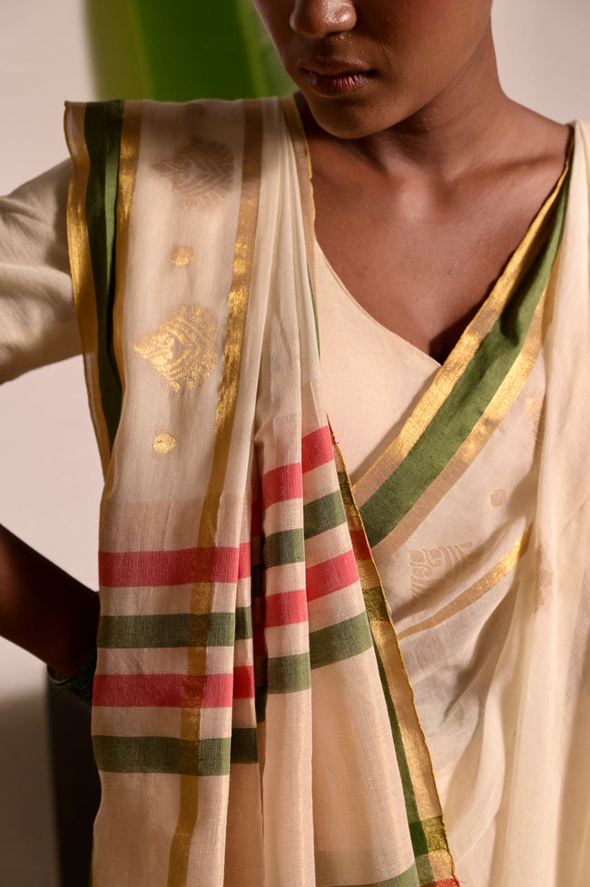 Kathakali Off white handwoven mul cotton saree with green and zari border