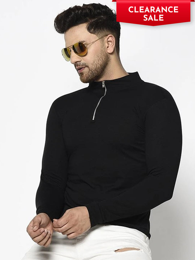 Step out in style with the Men Black High Neck With Zip Cotton Full Sleeve TShirt