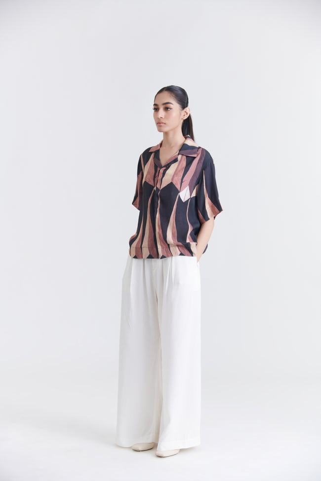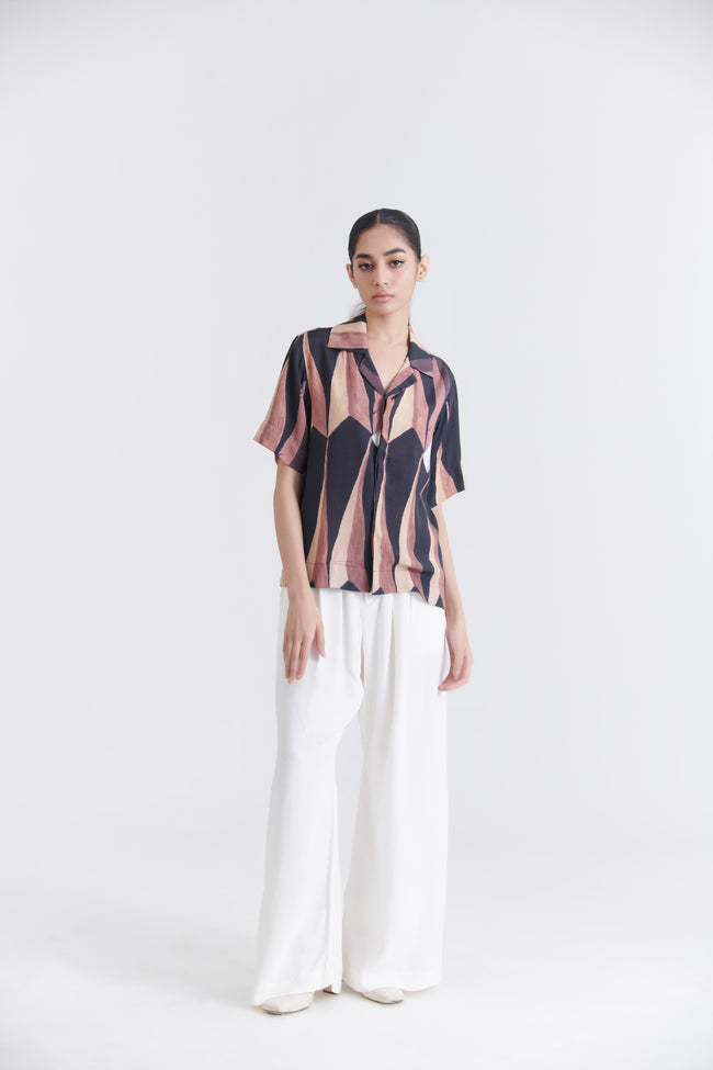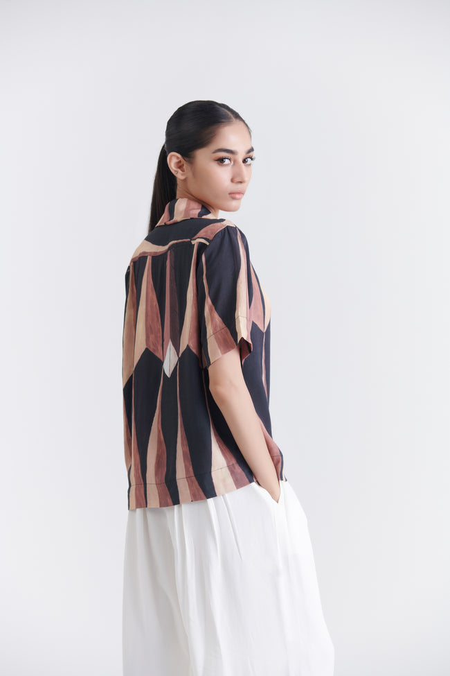 A half sleeve shirt with a camp collar that features the Pandan print depicting the interconnecting of the pandan leaves in an Indian garland.