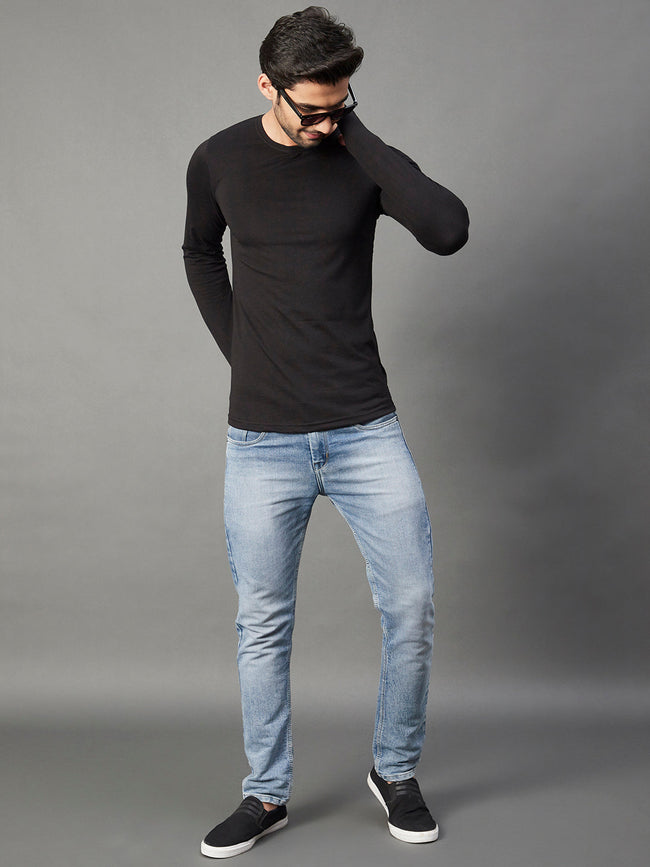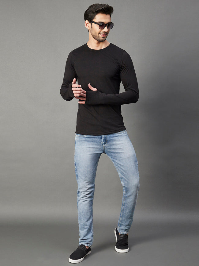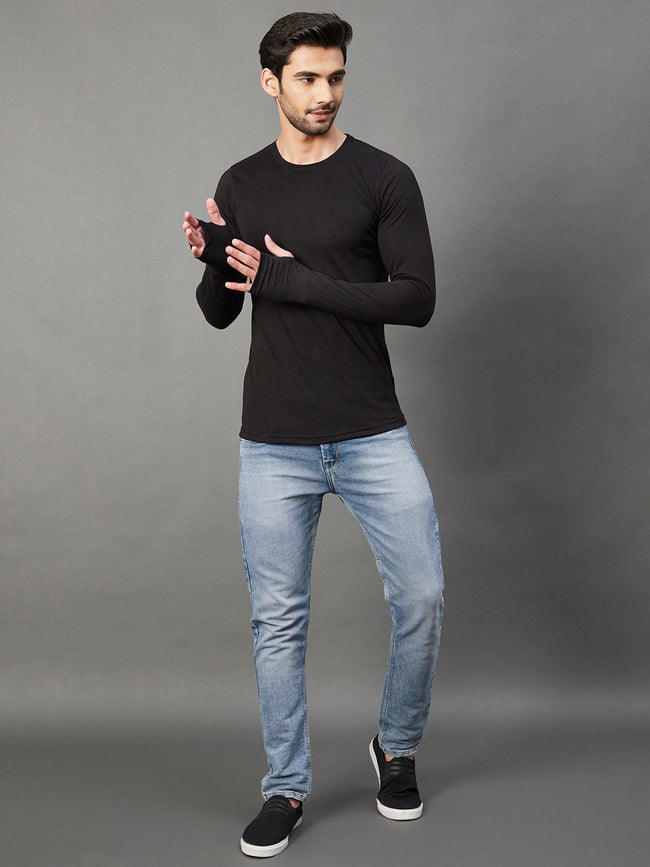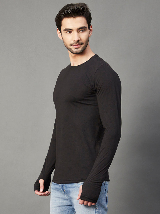 Men Black Thumbhole Round Neck Full Sleeve T-Shirt