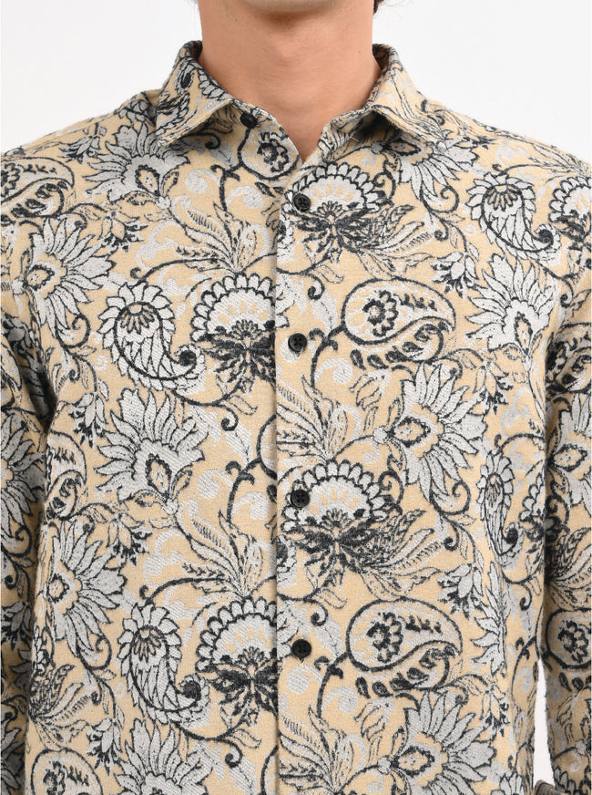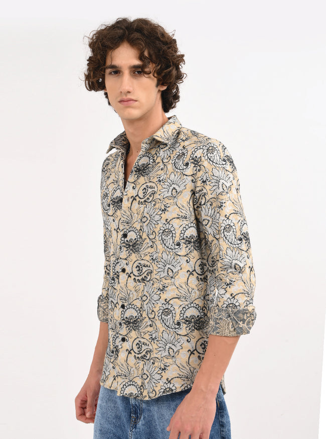 Vintage soul, modern edge. This slim-fit printed shirt features an all-over floral design woven into a rich self-jacquard cotton blend. The cream base balances the bold black and white floral motifs, giving it a quietly striking aesthetic. It’s detailed, expressive, and made for the guy who appreciates texture and story in his clothing. Whether you're dressing up for a weekend plan or just elevating your daily fits — this shirt adds depth without trying too hard.