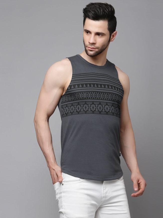 Step out in style with the Men Dark Grey Placement Print With Curved Bottom Sleeveless TShirt Vest