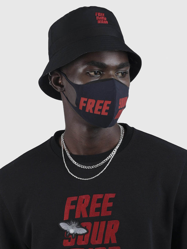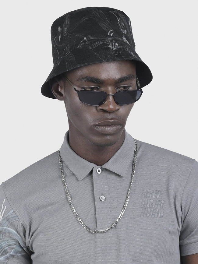 "FREE YOUR MIND" represents us taking control of the world of likes & lies to free our minds and take back our former selves. The “VISCERAL WIRES” print represents how technology has become an extension of our physical body without which our mind cannot function. / "FREE YOUR MIND" is embroidered on the bucket hat with a grosgrain tape stitched below it / The reversible side of the bucket hat is printed with the “VISCERAL WIRES” motif / The hat is made from carbon nylon and the reversible side is made from tencel