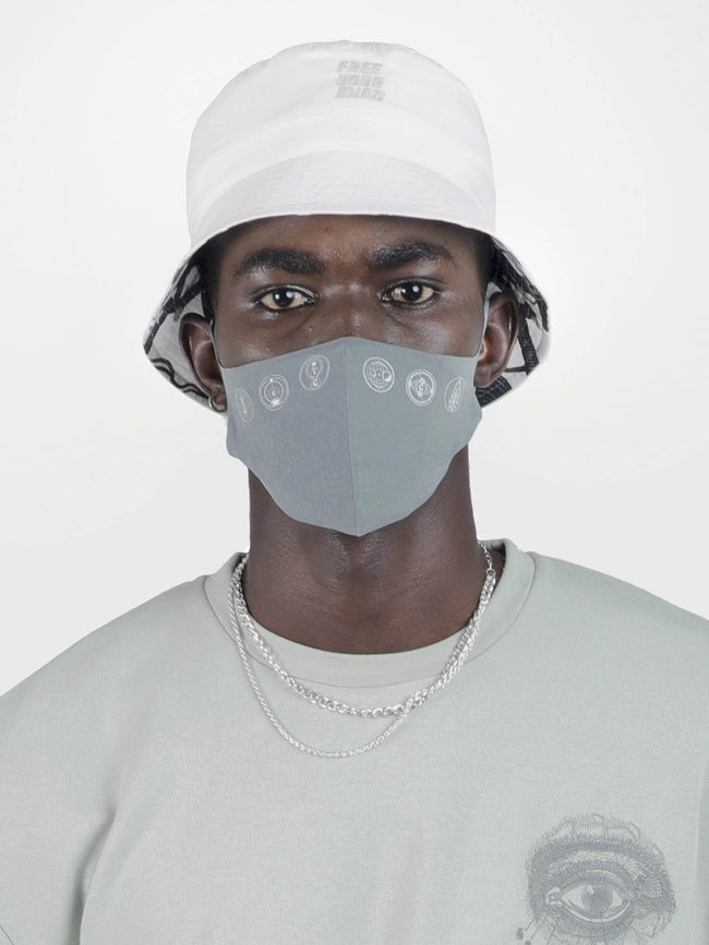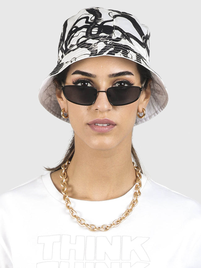FREE YOUR MIND" represents us taking control of the world of likes & lies to free our minds and take back our former selves. The “VISCERAL WIRES” print represents how technology has become an extension of our physical body without which our mind cannot function. / "FREE YOUR MIND" is embroidered on the bucket hat with a grosgrain tape stitched below it / The reversible side of the bucket hat is printed with the “VISCERAL WIRES” motif / The hat is made from carbon nylon and the reversible side is made from tencel