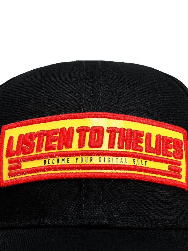 "LISTEN TO THE LIES" appliqued on woven embroidered badge on the front of the hat. Gunmetal clasp at the back. The hat is made from a cotton twill