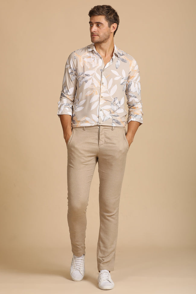 Get into the laid-back mindset of vacation with this tropical printed shirt in a breezy beige hue. Just one wear and you'll be feeling the vacay vibes! (Caution: may cause serious wanderlust).