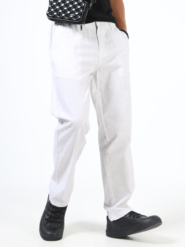 Relaxed-fit striped trousers with a comfortable elastic waistband, zip pockets, and button closure. Lightweight and versatile, perfect for casual or smart-casual looks.