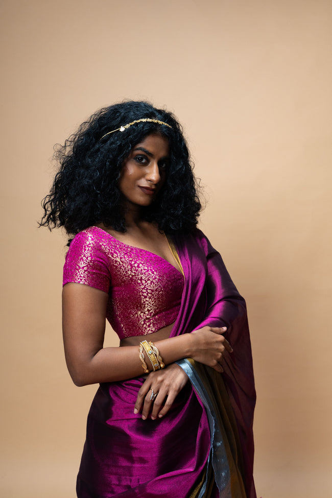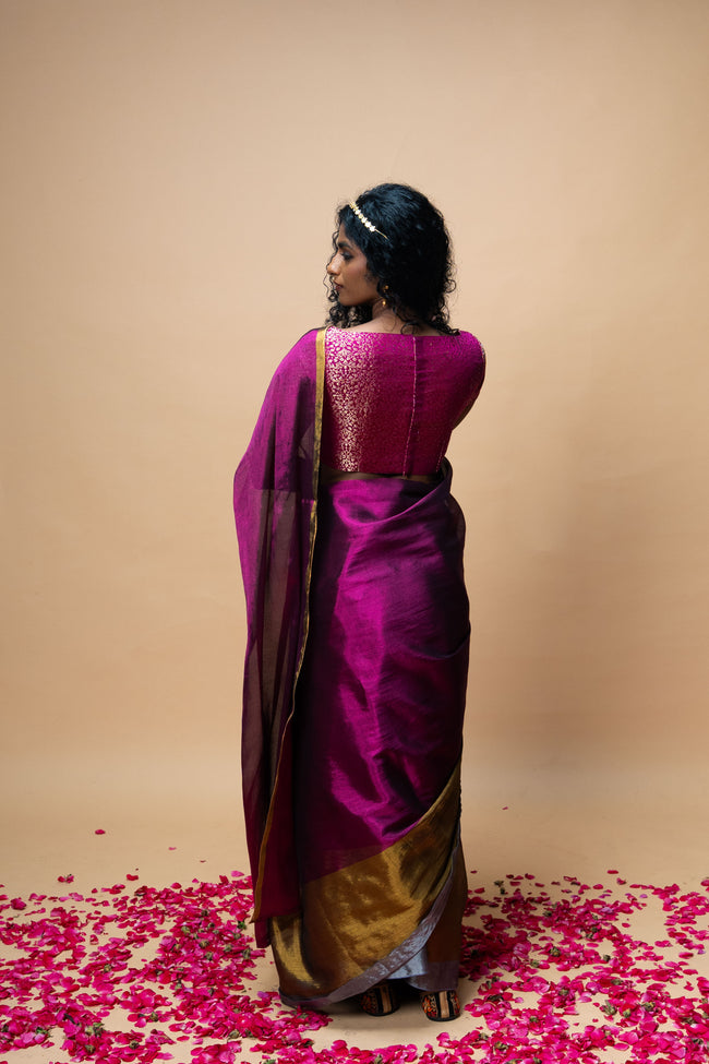 A rich purple handwoven tissue saree, enhanced with a gold and silver striped lower border and a delicate thin gold upper border. Woven with precision over four days, it radiates festive elegance and timeless allure, with every weave reflecting masterful craftsmanship.