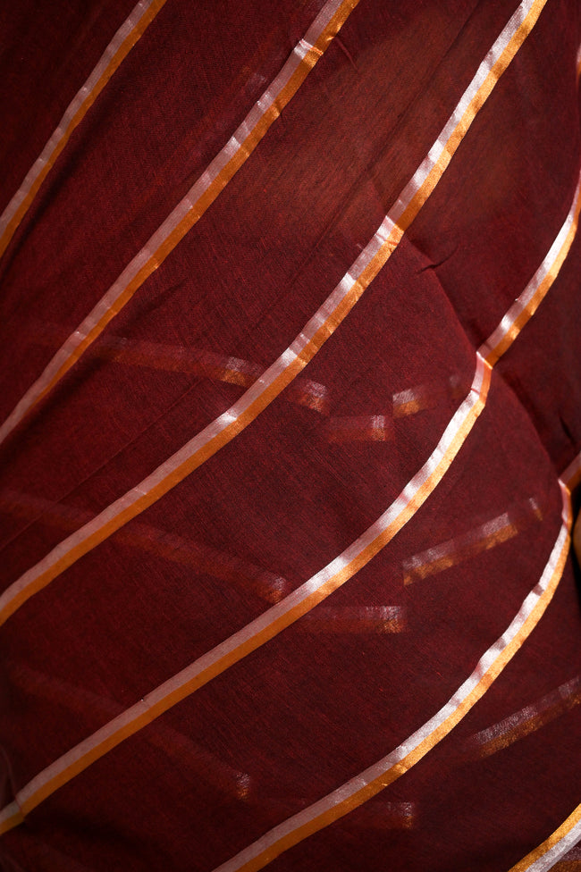 This rich maroon mul cotton saree features intricate golden and silver double stripes running throughout, adding a layer of shimmer and elegance. The deep maroon shade is beautifully complemented by the radiant gold and silver zari double stripes, creating a stunning contrast of sophistication and opulence. Handwoven over two days, this saree embodies timeless craftsmanship and refined luxury. Natural differences in color and weave are inherent to the textile and contribute to the uniqueness of each handwoven piece.