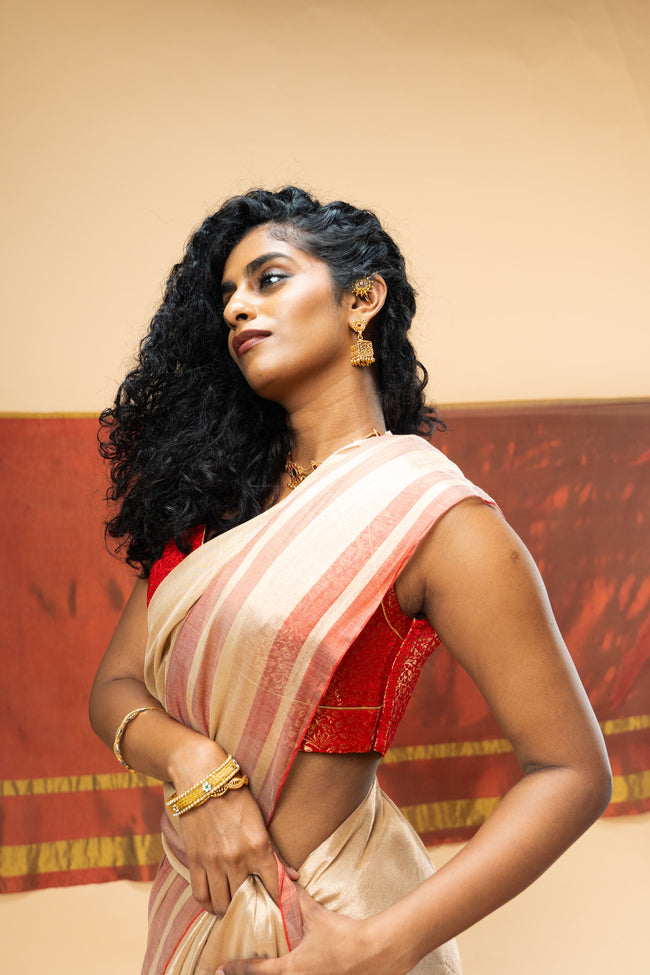 A luxurious rose gold handwoven tissue saree, highlighted with a rich red striped lower border and a matching red upper border. Meticulously woven over four days, it radiates festive elegance and timeless charm, with every weave reflecting exquisite craftsmanship.