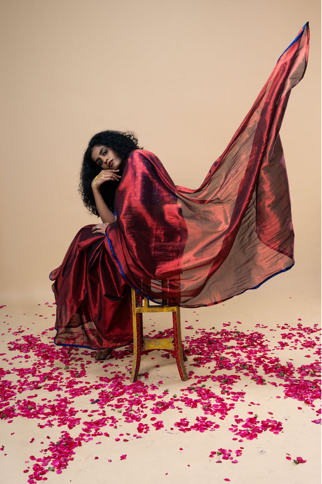 This red handwoven tissue saree radiates timeless elegance with its vibrant hue and lustrous finish. Accented with a contrasting blue border, it creates a striking balance of boldness and grace. Woven patiently over four days by skilled artisans, the saree reflects exquisite craftsmanship. Its intricate weave and festive appeal make it a perfect drape for celebrations and special occasions.