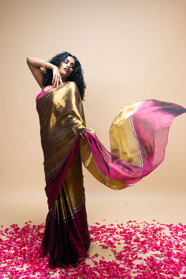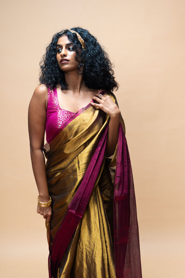 TAVYA I Gold Handwoven Tissue Saree with Dark Pink and Silver Striped Border