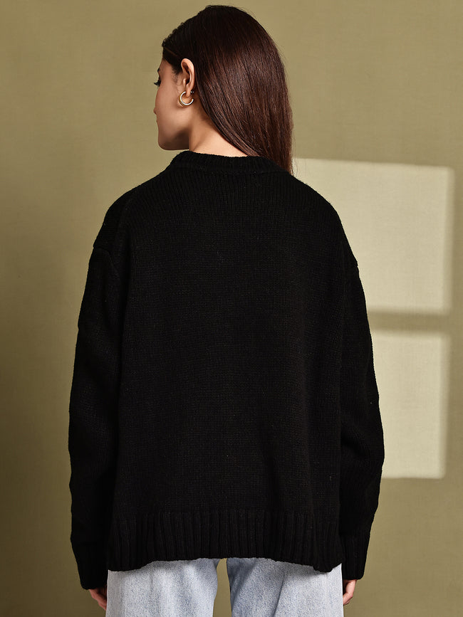 A black acrylic full sleeve knit sweater designed for warmth and style
