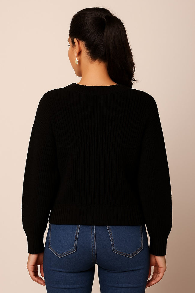 A black full sleeve knitted sweater designed for warmth and simplicity