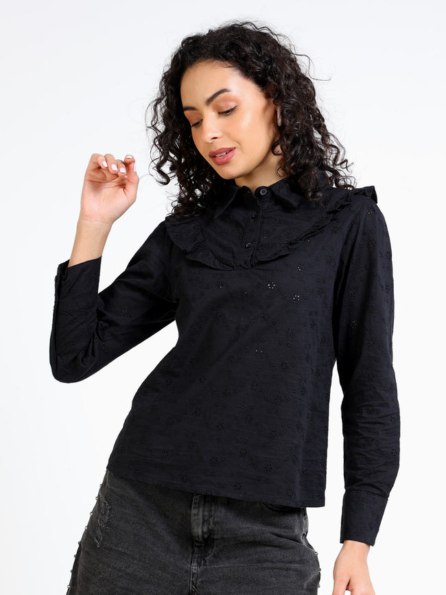 Women Black Shiffli Top with Frill inserts